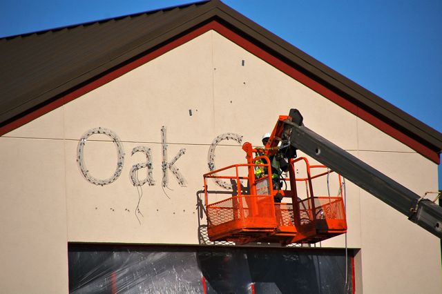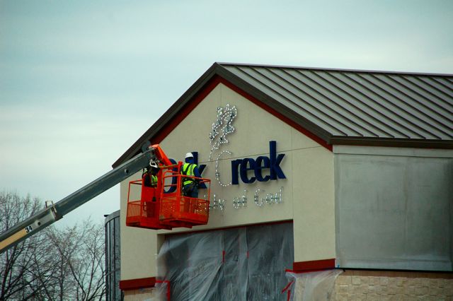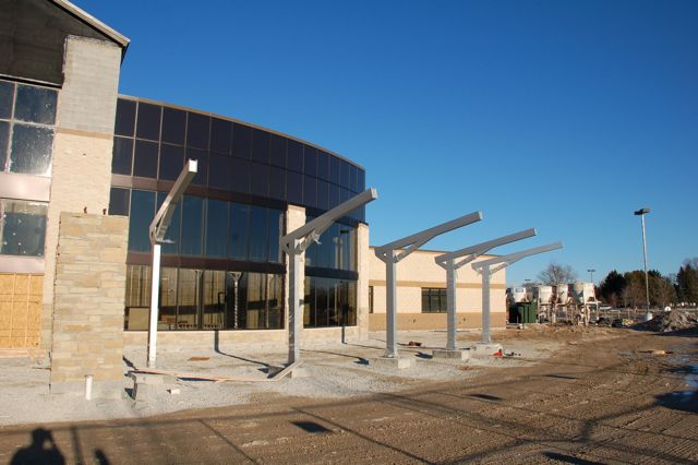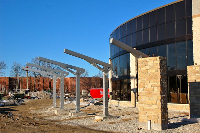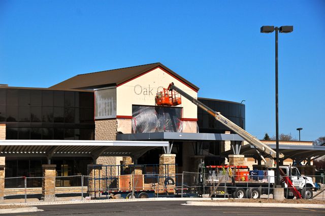 Work on the exterior of the building has resumed now that the weather is warming up. The sign on the south side of the new building facing I-94 is currently being installed.
