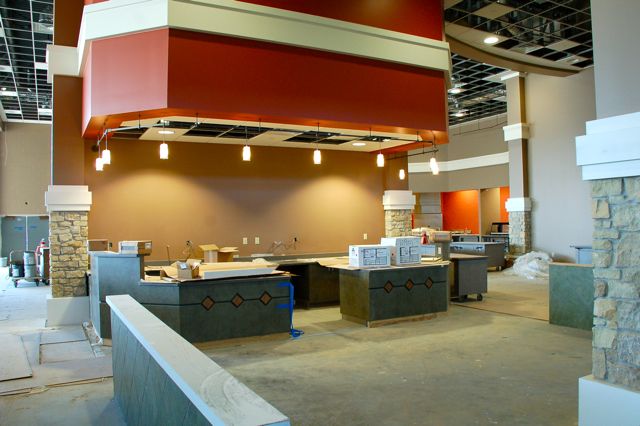 Food service equipment and countertops are installed in the cafe and coffee bar.