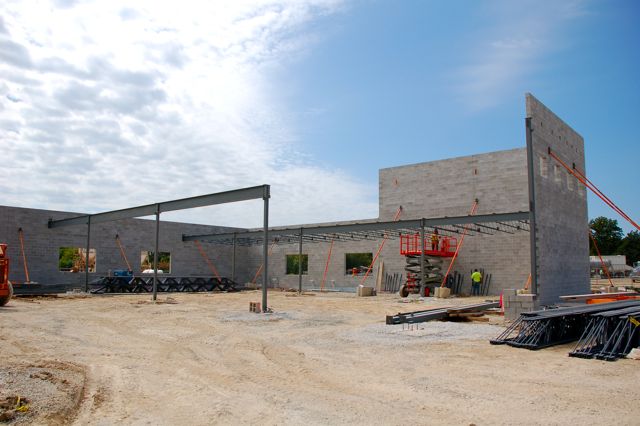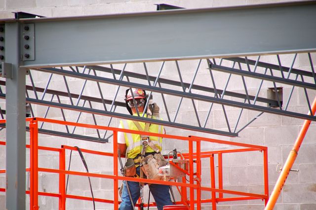 Steel for the preschool area arrived this last week and workers have begun lifting it into place and welding it together.