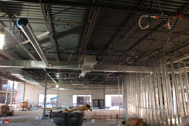 Walls, heating ducts and sprinklers are all being installed in the preschool section.